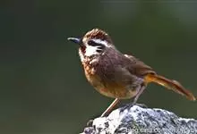 白颊噪鹛是雀形目噪鹛科噪鹛属鸟类,又称土画眉、小画眉、小噪鹃。成鸟额至头顶栗褐色,长眉纹、眼先和颊纹棕白色,眼后至耳羽深褐色,…全部>>