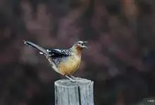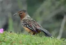 大噪鹛:中型鸟类,体长32-36厘米。额至头顶黑褐色,背栗褐色满杂以白色斑点,斑点前缘或四周还围有黑色。初级覆羽、大覆羽和初级飞羽具白色端斑。尾特长,均具黑色亚端斑和白色端斑。颏、喉棕褐色,…全部>>