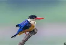 鹳嘴翡翠:体长33-37厘米。体重140-200克。共有13个亚种,体型大,嘴形巨大、侧扁,似鹳嘴,红色,嘴峰两侧有鼻沟。头灰褐色,上体蓝色,下体和宽阔的领环赭土色,脚红色。飞翔时翅上无斑。全部>>