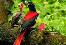 朱鹂:中等鸟类,体长23-28厘米。雄鸟绛紫红色,头、上胸及翼黑色。雌鸟上背及背部深灰色,尾覆羽及尾绛紫红色,腹部及下胸白而密布黑色纵纹。与鹊色鹂幼鸟的区别在上背灰色较深,下体白色较少且纵纹较粗。…全部>>