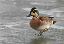绿翅鸭是小型鸭类,体长37厘米,体重约0.5千克。嘴脚均为黑色。雄鸟头至颈部深栗色,头顶两侧从眼开始有一条宽阔的绿色带斑一直延伸至颈侧,尾下覆羽黑色,两侧各有一黄色三角形斑,在水中游泳时,极为醒目。…全部>>