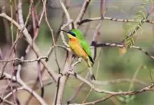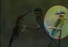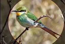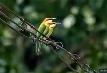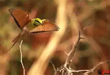 栗喉蜂虎是蜂虎科蜂虎属的鸟类。有热带鸟类羽毛艳丽的特征:喉部是栗红色的,黑色的过眼纹,翅膀和背部是绿色的,尾翼是蓝色的,飞行时翅膀下面的羽毛是橙黄色的,在阳光的照射下,它们全身闪烁着金属般的艳丽光泽,…全部>>