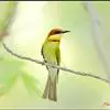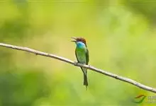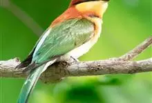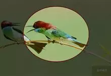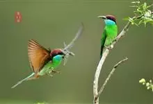 栗喉蜂虎是蜂虎科蜂虎属的鸟类。有热带鸟类羽毛艳丽的特征:喉部是栗红色的,黑色的过眼纹,翅膀和背部是绿色的,尾翼是蓝色的,飞行时翅膀下面的羽毛是橙黄色的,在阳光的照射下,它们全身闪烁着金属般的艳丽光泽,…全部>>