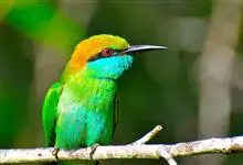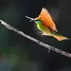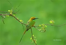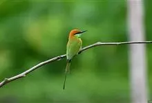 绿喉蜂虎是佛法僧目、蜂虎科的小型鸟类,共有9个亚种。身长22-25厘米,翼展29-30厘米,体重15-20克。喉绿色,额部、头顶至上背为锈红色,其余上体均为亮绿色。中央尾羽延长且端段狭细,…全部>>