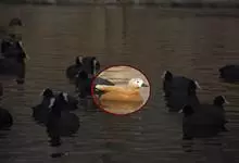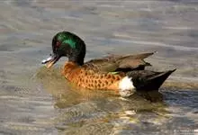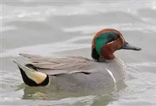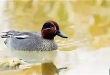 绿翅鸭是小型鸭类,体长37厘米,体重约0.5千克。嘴脚均为黑色。雄鸟头至颈部深栗色,头顶两侧从眼开始有一条宽阔的绿色带斑一直延伸至颈侧,尾下覆羽黑色,两侧各有一黄色三角形斑,在水中游泳时,极为醒目。…全部>>