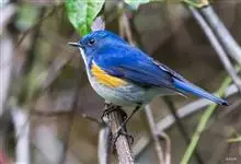 红胁蓝尾鸲俗名:蓝点冈子、蓝尾巴根子、蓝尾杰、蓝尾欧鸲。体型略小而喉白的鸲。特征为橘黄色两胁与白色腹部及臀成对比。雄鸟上体蓝色,眉纹白;亚成鸟及雌鸟褐色,尾蓝。…全部>>