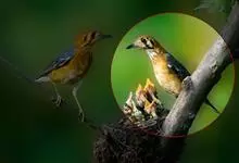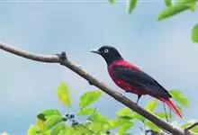 朱鹂:中等鸟类,体长23-28厘米。雄鸟绛紫红色,头、上胸及翼黑色。雌鸟上背及背部深灰色,尾覆羽及尾绛紫红色,腹部及下胸白而密布黑色纵纹。与鹊色鹂幼鸟的区别在上背灰色较深,下体白色较少且纵纹较粗。…全部>>