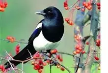 喜鹊:是鸦科、鹊属的一种鸟类。共有11个亚种。体长40-50厘米,雌雄羽色相似,头、颈、背至尾均为黑色,并自前往后分别呈现紫色、绿蓝色、绿色等光泽,双翅黑色而在翼肩有一大形白斑,尾远较翅长,呈楔形,…全部>>