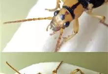 耶气步甲,鞘翅目, 步甲科,屁步甲属,又称屁步甲,头、前胸背板棕黄色;头顶有心形黑斑;小盾片和鞘翅黑色,各鞘翅肩部和中部有1黄色斑;各鞘翅有7条纵隆脊,…全部>>