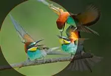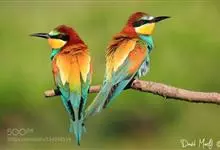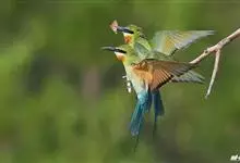 栗喉蜂虎是蜂虎科蜂虎属的鸟类。有热带鸟类羽毛艳丽的特征:喉部是栗红色的,黑色的过眼纹,翅膀和背部是绿色的,尾翼是蓝色的,飞行时翅膀下面的羽毛是橙黄色的,在阳光的照射下,它们全身闪烁着金属般的艳丽光泽,…全部>>