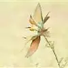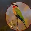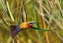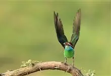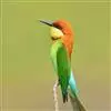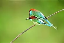 栗喉蜂虎是蜂虎科蜂虎属的鸟类。有热带鸟类羽毛艳丽的特征:喉部是栗红色的,黑色的过眼纹,翅膀和背部是绿色的,尾翼是蓝色的,飞行时翅膀下面的羽毛是橙黄色的,在阳光的照射下,它们全身闪烁着金属般的艳丽光泽,…全部>>