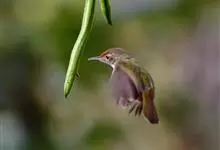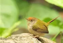 普通缝叶莺,是雀形目鹅科莺亚科缝叶莺属一种。体长10-14厘米,体重7-10克,雄鸟前额棕红,头顶至枕棕橄榄褐,上体橄榄绿染黄,飞羽及尾羽暗褐;繁殖期雄鸟的中央尾羽特形延长,下体淡皮黄白色。…全部>>