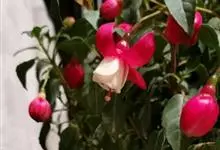倒挂金钟是柳叶菜科倒挂金钟属亚灌木植物。茎直立,多分枝;幼枝带红色,被短柔毛与腺毛,老时渐无毛;叶对生,卵形或窄卵形,脉常带红色;常带红色,被短柔毛与腺毛;花筒红色,筒状钟形,…全部>>
