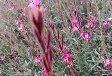 小花山桃草,是柳叶菜科山桃草属一年生草本植物。茎直立,不分枝;叶宽倒披针形,先端锐尖;花序呈穗状,花瓣白色,后红色,密集呈鞭状、倒卵形;果呈纺锤形,有不明显棱;花期7-8月,果期8-9月。…全部>>
