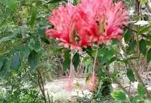 吊灯扶桑 Hook. f.)为锦葵科木槿属的常绿灌木。高达3米;小枝常下垂;叶椭圆形或长圆形,先端尖或短渐尖,基部楔形;花梗细,无毛或具纤毛,中部具节;蒴果长圆柱形;花期全年。因似灯笼高挂,…全部>>