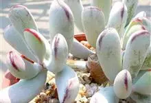 福娘为景天科银波锦属的肉质草本植物。对生的叶片呈短棒状,叶色灰绿,表覆白粉,叶缘外围镶着紫红色,叶片外形多有变化有短圆形、厚厚的方形等不同叶形;花期夏秋。福娘原产于非洲西南部的纳米比亚,…全部>>