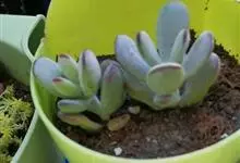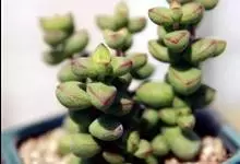 乒乓福娘,植株叶片退化成扁卵状,植株为直立的肉质灌木,能够长高。叶片对生,扁卵型至圆卵形,叶片顶端紫红圆叶尖,叶面有一层白粉。强光下叶片的顶端边缘会较红。初夏开花,聚伞状圆锥花序,花序较高,小花管状…全部>>