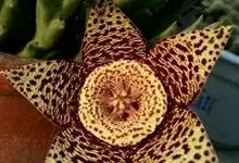 巨花犀角又称大豹皮花,是夹竹桃科犀角属的一种植物。茎粗,花大,边缘生长细毛。植株柱形多分枝呈丛生,柱形具4棱,棱缘具细小疣突。花大,五角星形黄色,并有横向棕褐色斑纹,似豹皮而得名。花期夏秋两季。…全部>>