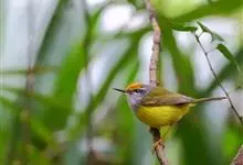 金头伪缝叶莺:体长10-12厘米,是一种体型小的棕顶冠、黄色腹森林莺类。头顶亮黄色,具明显的黄色眉纹,头侧、后颈和颈侧暗灰色,上体橄榄绿色,颏、喉及上胸部灰白,下胸及腹部为鲜艳黄色。两翅和尾褐色,羽…全部>>