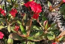 虎刺梅:别称铁海棠,是蔓生灌木植物。茎多分枝,长60-100厘米,直径5-10毫米,具纵棱,密生硬而尖的锥状刺,刺长1-1.5厘米,直径0.5-1.0 毫米,常呈3-5列排列于棱脊上,呈旋转。叶互生…全部>>