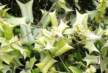 构骨叶冬青学名枸骨,又名猫儿刺、老虎刺、八角刺、鸟不宿、构骨、狗骨刺、猫儿香和老鼠树。常绿灌木或小乔木,高1-3米,二年枝褐色,三年生枝灰白色,叶片厚革质,花淡黄色,果球形,直径8-10毫米,成熟时…全部>>