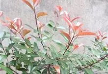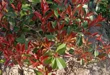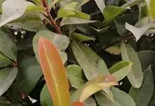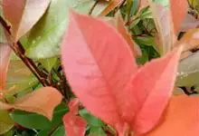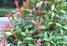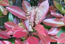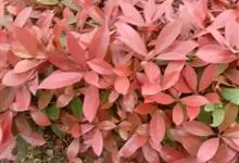 红叶石楠 是蔷薇科,石楠属杂交种,为常绿小乔木或灌木,乔木高可达5米、灌木高可达2米。叶片革质,长圆形至倒卵状、披针形,叶端渐尖,叶基楔形,叶缘有带腺的锯齿,花多而密,复伞房花序,花白色,梨果黄红色,…全部>>