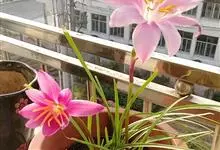 小韭兰学名韭菜莲又名风雨花、菖蒲莲、红玉帘和旱水仙,多年生草本,鳞茎卵球形,基生叶常数枚簇生,线形,扁平,花单生于花茎顶端,下有佛焰苞状总苞,花玫瑰红色或粉红色,蒴果近球形,种子黑色,花期夏秋。韭莲…全部>>