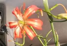东北百合,别名卷莲花、老哇芋头、轮叶百合、伞蛋花、山丹花,为百合科、百合属多年生球根花卉。鳞茎卵圆形,白色,有节。苞片叶状,花淡橙红色,具紫红色斑点;花被片稍反卷,蒴果倒卵形,花期7-8月,果期9月,…全部>>