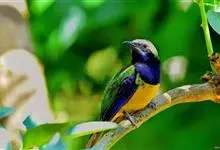 橙腹叶鹎体形大小和金额叶鹎相似,体长16~20厘米。额至后颈黄绿色,其余上体绿色,小覆羽亮钴蓝色,形成明显的肩斑。颏、喉、上胸黑色具钴蓝色髭纹,其余下体橙色。飞羽和尾羽雄鸟黑色、雌鸟绿色。…全部>>