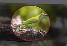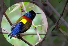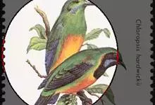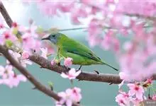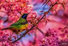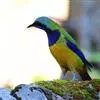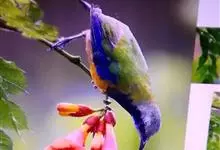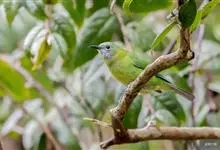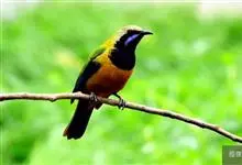 橙腹叶鹎体形大小和金额叶鹎相似,体长16~20厘米。额至后颈黄绿色,其余上体绿色,小覆羽亮钴蓝色,形成明显的肩斑。颏、喉、上胸黑色具钴蓝色髭纹,其余下体橙色。飞羽和尾羽雄鸟黑色、雌鸟绿色。…全部>>