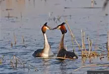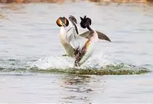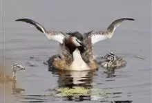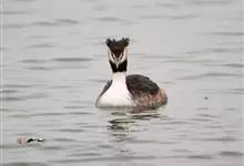 凤头鸊鷉:体长为50厘米以上,体重为0.5-1千克。前额和头顶部黑褐色,枕部两侧的羽毛往后延伸,分别形成束羽冠。脚的位置几乎处于身体末端,尾羽短而不显,趾侧有瓣蹼。瓣蹼十分发达,除了适于游水之外,…全部>>