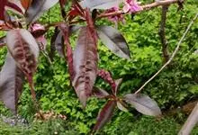 紫叶桃花是李亚科,桃属植物桃的变种,叶为窄椭圆形至披针形,长15厘米,宽4厘米,先端成长而细的尖端,边缘有细齿,暗绿色有光泽,叶基具有蜜腺;树皮暗灰色,随年龄增长出现裂缝;花单生,从淡至深粉红或红色,…全部>>