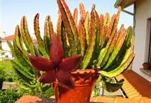 大花犀角是夹竹桃科犀角属的多年生肉质草本植物,茎基部分枝,有齿状突起,灰绿色,形如犀牛角,花大,五裂张开,星形淡黄色,具淡黑紫色横斑纹,边缘密生长细毛,具臭味;花期在7—8月。大花犀角原产地在南非,…全部>>