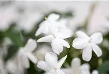 素馨花,木犀科素馨属多年生的攀援灌木植物。攀援灌木,小枝圆柱形,具棱或沟;叶对生,叶轴常具窄翼,小叶片卵形或长卵形;聚伞花序顶生或腋生,花序梗长,苞片线形,花萼无毛,裂片锥状线形,花冠白色,…全部>>