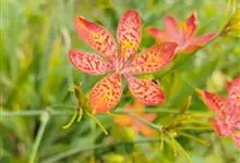射干 Redouté)是鸢尾科射干属多年生草本植物。根状茎为不规则的块状,斜黄色或黄褐色;花橙红色,散生紫褐色的斑点;花药呈条形;子房下位,倒卵形;蒴果倒卵形或长椭圆形;种子圆球形,黑紫色,有光泽。…全部>>