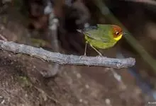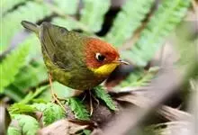 金冠地莺:形态与灰腹地莺相似,上体橄榄绿,前额至头顶渲染亮金黄色;下体几乎纯暗石板灰色,下嘴基部橙红色或橙黄色。虹膜褐色;上嘴角褐色,下嘴基部橙红色或深橙黄色直至嘴尖;跗跖和趾褐色,爪褐色。…全部>>