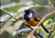 金胸雀鹛是莺科、雀鹛属小型鸟类,体长10-11厘米。头黑色,头顶中央有一道白色中央冠纹,颊和耳羽亦为白色,在黑色的头部极为醒目。上体深灰沾绿。两翅黑色,外侧飞羽有黄色外缘和白色端斑;尾凸状、黑色。…全部>>