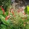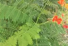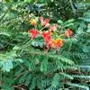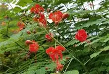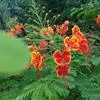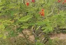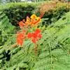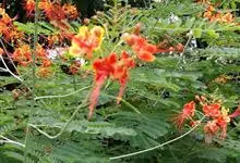 洋金凤 Sw.),豆科小凤花属灌木状或小乔木植物,枝无毛,绿或粉绿色;二回羽状复叶;总状花序伞房状,萼片无毛,花瓣橙红或黄色,圆形,花丝红色,子房无毛,花柱橙黄色;荚果窄而薄,…全部>>