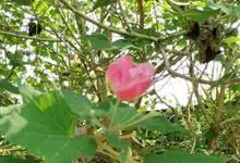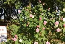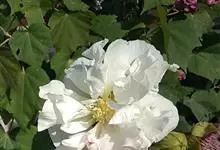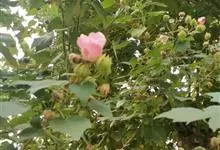 木芙蓉,锦葵科木槿属落叶灌木或小乔木。小枝上有细绒毛;叶片为卵状心形,托叶为披针形,常早落;花单生,花萼为钟形,花冠初为白色或淡红色,后逐渐变为深红色;果实为扁球形,有淡黄色的毛附着。花期8到10月。…全部>>