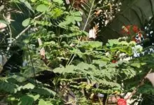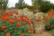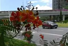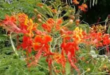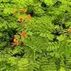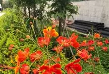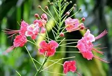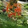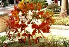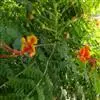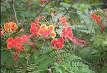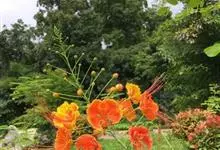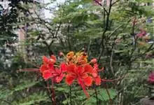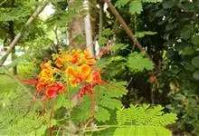 洋金凤 Sw.),豆科小凤花属灌木状或小乔木植物,枝无毛,绿或粉绿色;二回羽状复叶;总状花序伞房状,萼片无毛,花瓣橙红或黄色,圆形,花丝红色,子房无毛,花柱橙黄色;荚果窄而薄,…全部>>