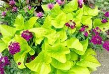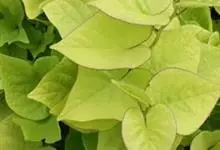 金叶番薯是旋花科番薯属的多年生草本植物。茎略呈蔓性;叶呈心形或不规则卵形,全缘或有分裂,叶色为黄绿色,嫩叶具绒毛;花单生或组成腋生聚伞花序或伞形至头状花序,花呈剌叭形;花期10-11月。…全部>>