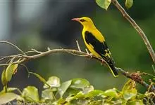 金黄鹂是中型鸣禽。体长24厘米。头全黄色。体羽鲜丽,主要由为黄和黑的颜色组合,雌鸟与幼鸟多具条纹。雄性成鸟眼先、翼及尾基部黑色,其余为鲜亮黄色。雌鸟较暗淡而多绿色。幼鸟偏绿色,下体具细密纵纹。虹膜红…全部>>