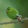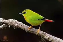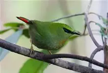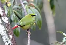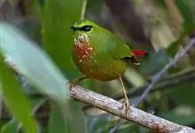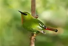 火尾绿鹛是莺科、绿鹛属小型鸟类,体长11-14厘米。上体绿色,头顶至枕具黑色鳞状斑,眼先和眼后黑色,眉纹黄绿色。两翅黑色具黄色和红色翅斑及白色端斑,极为醒目。中央一对尾羽绿色,外侧尾羽鲜红色。…全部>>