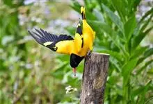 金黄鹂是中型鸣禽。体长24厘米。头全黄色。体羽鲜丽,主要由为黄和黑的颜色组合,雌鸟与幼鸟多具条纹。雄性成鸟眼先、翼及尾基部黑色,其余为鲜亮黄色。雌鸟较暗淡而多绿色。幼鸟偏绿色,下体具细密纵纹。虹膜红…全部>>