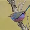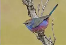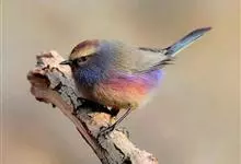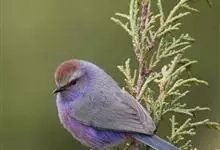 凤头雀莺:小型鸟类。体长9-10厘米,雄鸟呈毛茸茸的紫色和绛紫色,顶冠淡紫灰色,额及凤头白色,尾全蓝。雌鸟喉及上胸白,至臀部渐变成淡紫色,耳羽灰,…全部>>