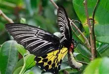 金裳凤蝶是凤蝶科、裳凤蝶属的动物。金裳凤蝶身体呈黑色,头、颈和胸侧有红毛,腹部有黑黄两色相间条纹,雄蝶前翅黑色,具黑天鹅绒光泽,各脉两侧灰白色,后翅金黄色,各室外缘有等腰三角形黑斑1枚,斑内侧有晕,…全部>>