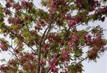 红花刺槐是豆科刺槐属的植物。其干皮深纵裂;枝具托叶刺,羽状复叶互生,叶片卵形或长圆形,具芒尖;基部圆形。花两性;总花序下垂;花冠粉红色,芳香;果条状长圆形,腹缝有窄翅。花期4~5月,果期9~10月。…全部>>