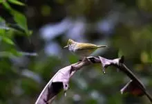 白腹凤鹛是绿鹃科、绿凤鹛属的小型鸟类,体长10-12厘米。上体从头到尾黄绿色,有短的羽冠,头顶微具黑色羽轴纹;眼先、眼周,耳羽和下体灰白色,尾下覆羽黄色。虹膜褐色或红褐色,上嘴浅褐色或肉褐色,…全部>>