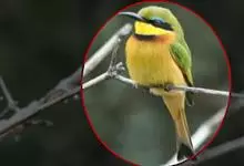 黄喉蜂虎属中型鸟类,体长23-30厘米。喉黄色,其下有一窄的黑色胸带;胸带以下的整个下体蓝绿色。前额蓝白色,具一宽的黑色贯眼纹,头顶至后颈暗栗色,尾蓝绿色,中央尾羽延长,明显突出于其他尾羽。…全部>>