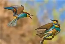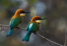 栗喉蜂虎是蜂虎科蜂虎属的鸟类。有热带鸟类羽毛艳丽的特征:喉部是栗红色的,黑色的过眼纹,翅膀和背部是绿色的,尾翼是蓝色的,飞行时翅膀下面的羽毛是橙黄色的,在阳光的照射下,它们全身闪烁着金属般的艳丽光泽,…全部>>